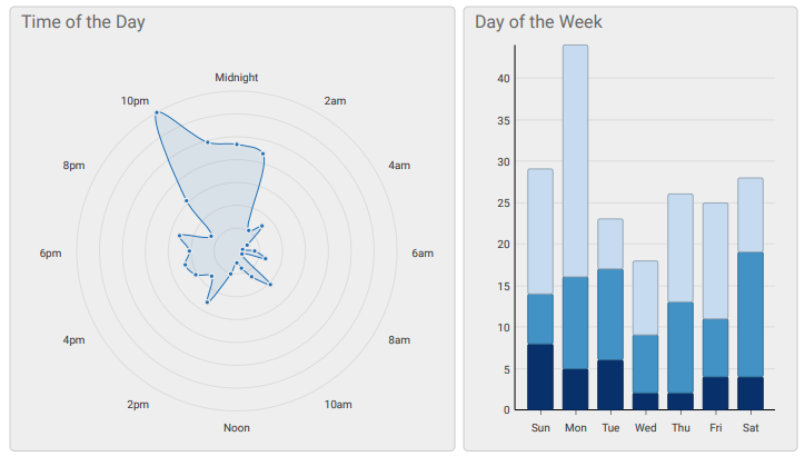 By day of the week, Sunday and Monday were the busiest for reported incidents, while Tuesday and Wednesday saw noticeably fewer. The weekend spike may reflect increased activity around Newport’s parks and waterfront areas.